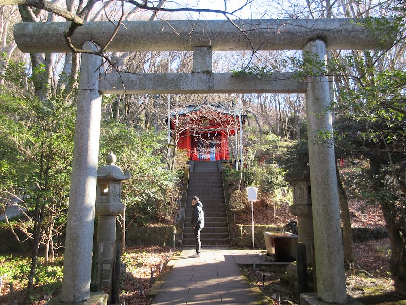 鳥居の向こうに相模湾と大島