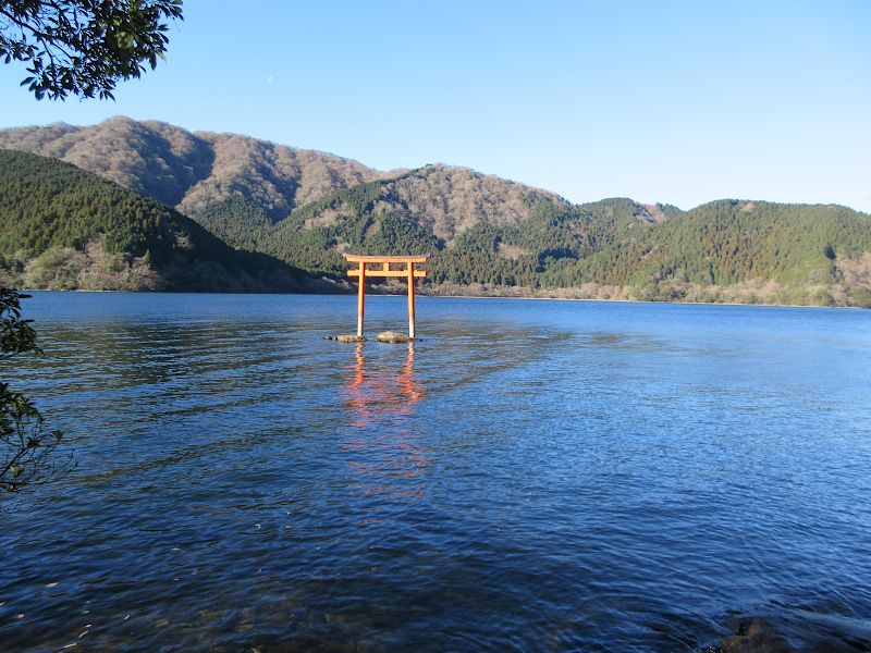 芦ノ湖の中に鳥居が立ってる